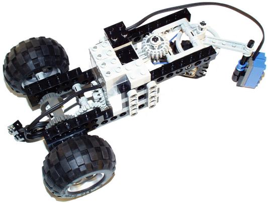 I first built the front steering wheel using the large pulley as a base. It is attached to a crossaxle with a perpendicular connector. That makes a nice compact support without requiring any bracing. Turning the wheel with a pulley greatly simplifies the placement of the steering motor, since gear meshing isn't an issue.