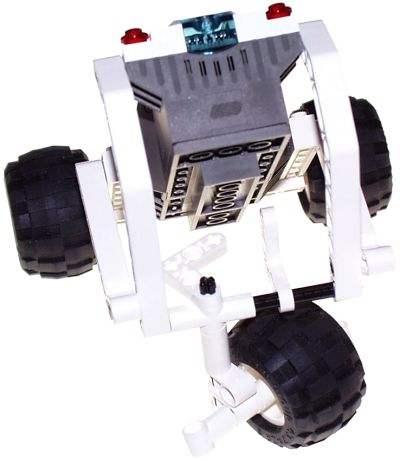 My design drives in a straight line while moving forward, and turns while in reverse. It turns so sharply (to keep the turning radius down) that it almost hops around backwards. Besides the wheels, all of the parts are from the DDK itself. After I started building it I decided it should use white pieces wherever possible, so there are some white connectors doing double duty as bushings.